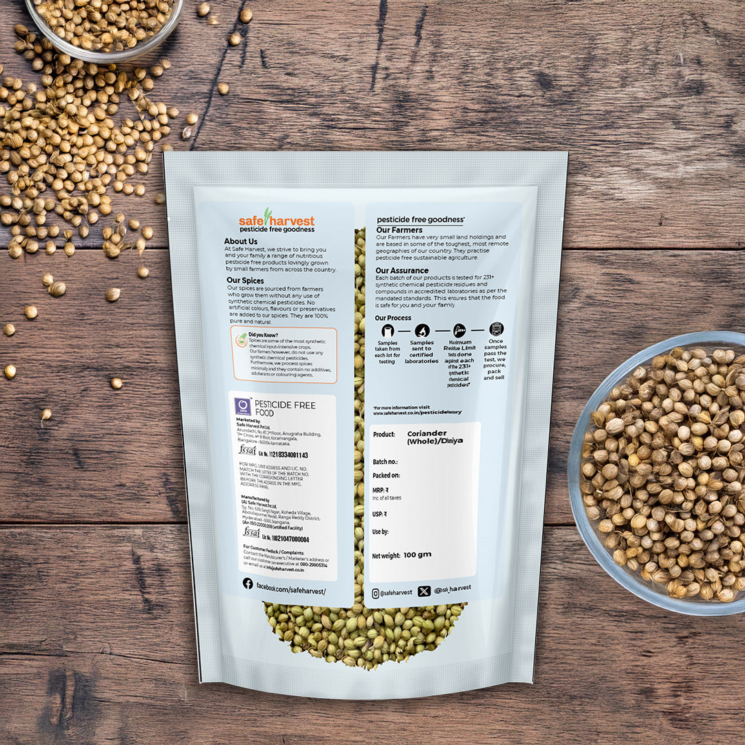 Safe Harvest Coriander Seeds undergo rigorous testing to ensure they are free from harmful pesticide residues and contaminants. Rich in dietary fibre, iron, and essential minerals, they are a healthy addition to your daily meals.